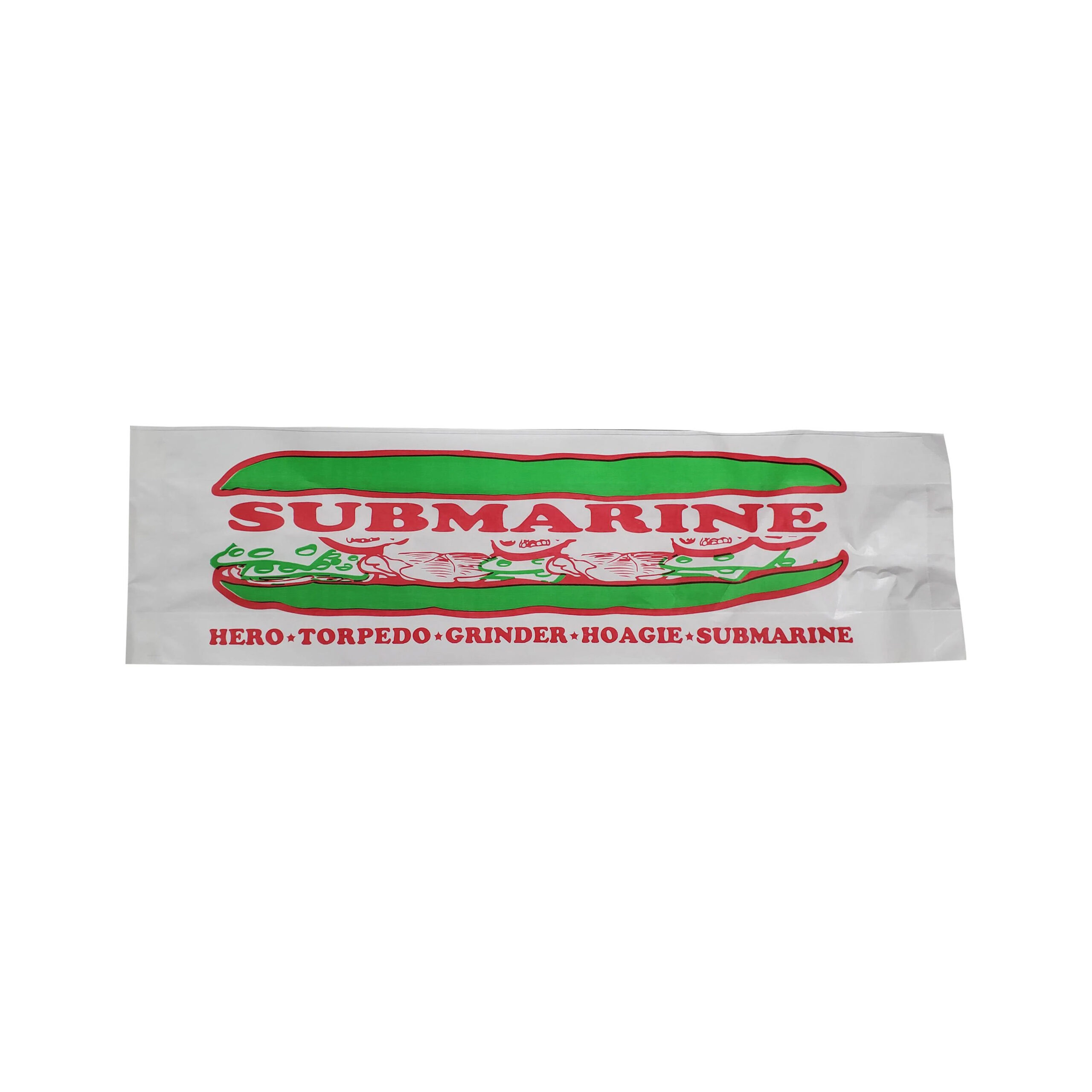 This white submarine bag features a durable construction and eye-catching printed design, perfect for packaging subs, hoagies, and sandwiches. Ideal for delis, takeout, and fast-food operations, it helps maintain freshness while offering a clean and professional presentation.